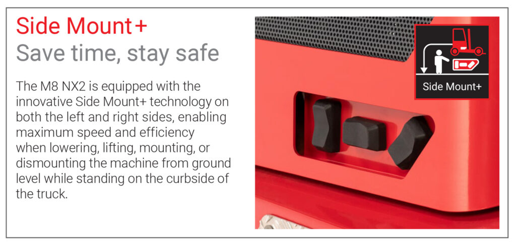 A key innovation of this series is the new side mount capability. Operators can now safely mount or dismount the forklift using controls positioned on the side of the machine, while standing on the ground next to the unit, without needing to climb into the seat. This allows a swift and simplified mounting process and reduces the risk associated with repeatedly climbing on and off the machine during deliveries, improving both convenience and operator safety.